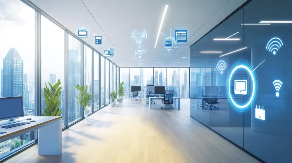 Ilustração de Wi-Fi 6 em ambiente corporativo, com dispositivos conectados, rede moderna e elementos visuais de tecnologia sem fio.